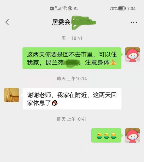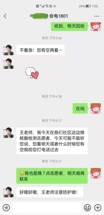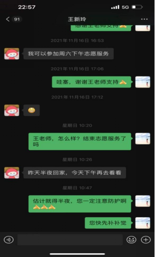 学院55岁以上教师王新玲、袁士彤第一时间加入了社区的志愿服务队伍。王新玲老师在1月8日第一时间参与到双新街昆香社区的核酸筛查工作的最前线,坚守岗位服务到深夜,并表示第二天还继续参加社区的志愿服务。袁士彤老师表示,“第一天就报到了,都没排上我,大家都太踊跃了,可能因为我年纪太大了,我第二天才正式加入了队伍”,在社区开展的3次筛查工作中均积极参与,每次都是通宵达旦开展服务工作。