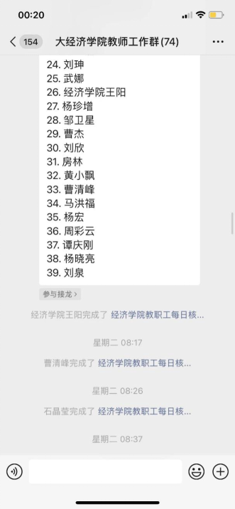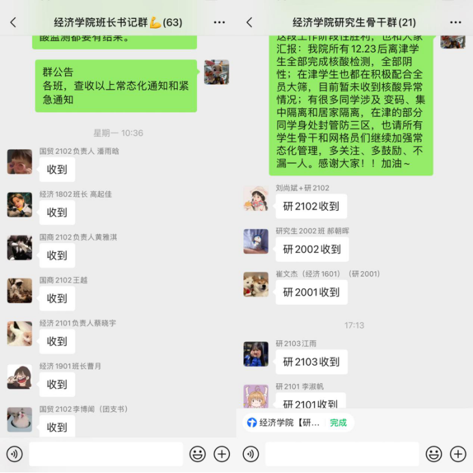 疫情爆发第一时间,学院迅速通过各班网格化联络机制,联系全院共1188名学生,第一时间摸排底数、了解每名学生动态和健康情况。同时,依靠辅导员-学生骨干-网格员队伍,连续奋战数个日夜,摸排每名同学具体情况,逐一排查包括核酸检测情况、健康码、离津情况、“封管防”三区底数等具体信息。面向学院717名12月23日后离津的学生,按照市教育两委“三个百分百”和“两个立即”的要求,逐人全部落实。同时,加强宣传教育,每天实时更新健康数据、隔离人数等信息,形成常态化管理。