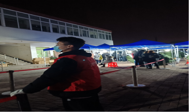 由于疫情发展迅速,时间紧任务重,工作人员们临时搭起的帐篷便成了检测场所,检测现场多有老人小孩,检测时间过长,居民们不免有所抱怨,孩子们也不免焦躁哭闹。而且随着天色渐黑,大家焦急又紧张的心便拧在了一起。这个时候,刘雨同学便会上前沟通,安抚情绪,维持秩序。检测工作结束后,她还需要整理现场,包括撤销警戒线、清理检测现场等工作。