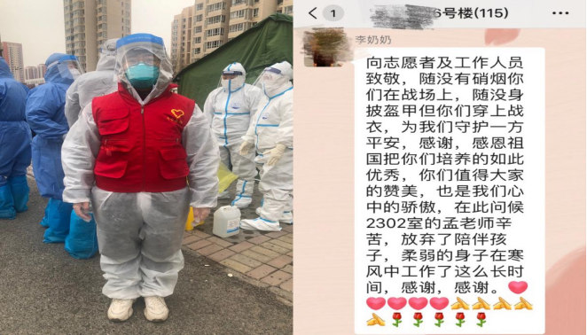 学院办公室孟晓哲老师主动参加社区第二轮核酸大筛,她在寒风中坚守,付出很多辛苦,却写下一封感谢信:“正能量满满的一天。感谢社区工作人员,精心组织周密部署,速度比一筛提高许多。感谢医护人员的付出,数九寒冬冲在前面。感谢小区居民的配合,九十多岁的老人,类风湿腿脚不便的病人,拄着拐的,怀里抱的,都克服困难下楼检测。感谢辛勤付出的志愿者,六十多岁的楼长奶奶,下沉社区的机关干部,忙前跑后的开心姐,做完手术还没恢复好的大哥。感谢中国好邻居攸妈,我的后半程就指着你的暖宝宝了。感谢王先生在家看孩子做饭。三筛继续努力!天津必胜”其实,我们想说的是,谢谢你,晓哲老师!而那隔壁李奶奶的点名赞扬,便是对您最大的肯定,有你真好。