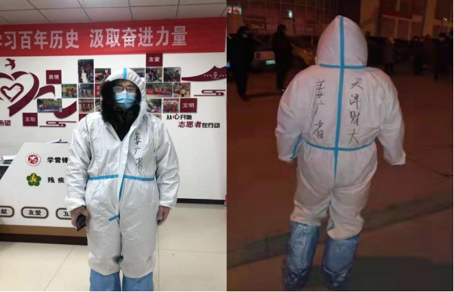 市场营销系吴波老师主动与社区联系参与志愿服务,从下午1点持续到晚上10多,共同完成了陈塘庄街道双山新苑小区1000名居民的数据采集。企业管理系高楠老师在耀远里社区有序组织核酸筛查的登记和排队,姜广省老师1月11日晚上8点半至凌晨期间进行扫楼并做好方位指引、秩序维持,1月12日中午摆建相关检测座椅、隔离带、搭建核酸检测医护人员休息帐篷等设施,晚上6点半至夜间,再次进行扫楼、指引。从天明到夜深,他说:“作为一名中共党员,我愿尽绵薄之力,我们一定能奏响胜利的凯歌。”防护服上的几个大字格外显眼:“天津财大 姜广省”更是代表了一种天财精神!长时间坚守室外,天气显得异常寒冷,老师们的手有些僵硬、有些颤抖,但没有一个人退缩,用那颗火热的心不断坚守着。