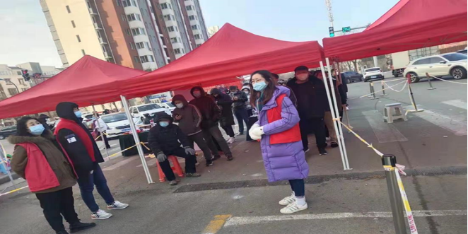 1月10日早7点,工商2101刘雨同学来到天津市东丽区采样地和顺家园中国结广场开始了一天的志愿服务工作,主要负责指引社区居民有序进行核酸登记以及通知未做核酸检测的居民及时检测。