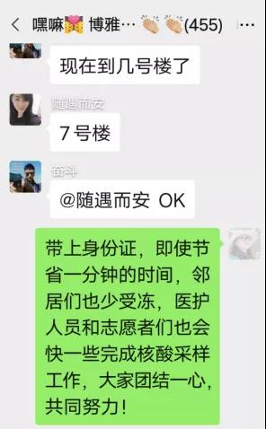 潘彩霞老师虽已返乡,仍在线上与津南社区一起战斗,微信提示邻居们“都带上身份证,即使节省一分钟,邻居们也少受冻,医护人员和志愿者们也会快一些完成核酸采样工作,大家团结一心,共同努力!”
