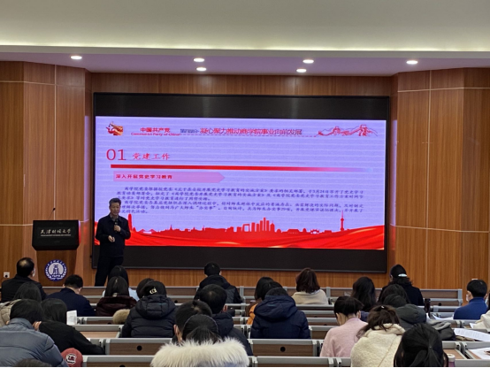 彭正银同志以“学习十九届六中全会精神 凝心聚力向前进”为主题,重点从全面总结党的百年奋斗的重大成就和历史经验对全会精神进行系统阐释,并围绕“牢记一个根本问题”、“两个‘确立’”、“三个‘需要’”、“四个历史时期 四个伟大飞跃”等关键词进行了深入宣讲和学习,强调马克思主义中国化的丰硕理论成果、日臻成熟的马克思主义政党、中华民族伟大复兴的历史进程、科学社会主义的伟大旗帜是中国共产党思想建党的辉煌成就。我们要深刻认识党百年奋斗的辉煌成就和历史意义,进一步把握规律、汲取智慧,坚定理想信念,无愧教育使命担当。最后,结合学院发展实际,围绕学院党建工作、学生工作、教学业绩、科研业绩四个方面,亮明学院特色,彰显出全院携手共进,凝心聚力推动学院事业向前发展的信心和决心。