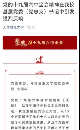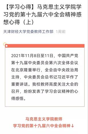 学院发挥学科专业优势,动员组织教师围绕全会精神开展理论研究和阐释,已有2篇文章在天津日报刊发;学院研究生社团“天津财经大学青年马克思主义研究会”正在组织开展马克思主义理论专业研究生学习十九届六中全会精神的征文比赛及研讨会,进一步推动兴起全会精神学习宣传贯彻的热潮,推动全会精神深入人心。