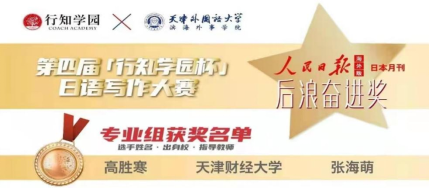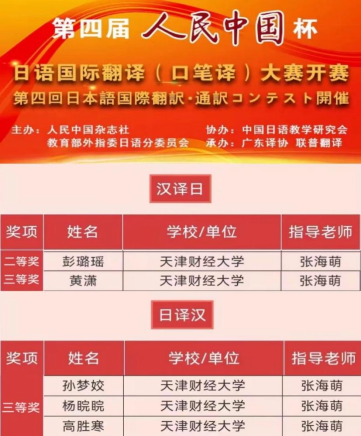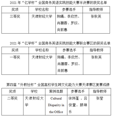 近日,喜讯传来,人文学院师生在多个学科竞赛中取得佳绩,其中,商务英语系陈曦、李欣然、肖灏霏、罗琰、尚前惠5名同学获“亿学杯”全国商务英语实践技能大赛全国总决赛三等奖、联合赛区一等奖,张秋英老师获优秀指导教师称号;由商务英语系张莹老师指导的徐玮蓬,吕俊萱,滕琳乐3位同学参加第4届“外教社杯”全国高校学生跨文化能力大赛,获天津赛区复赛二等奖;日语系彭璐瑶、黄潇、孙梦娇、杨皖皖、高胜寒5名同学分获第四届“人民中国杯”日语国际翻译大赛二等级和三等奖,高胜寒获得由人民日报海外版月刊特别设立的“后浪奋进奖”,张海萌老师获优秀指导教师奖。