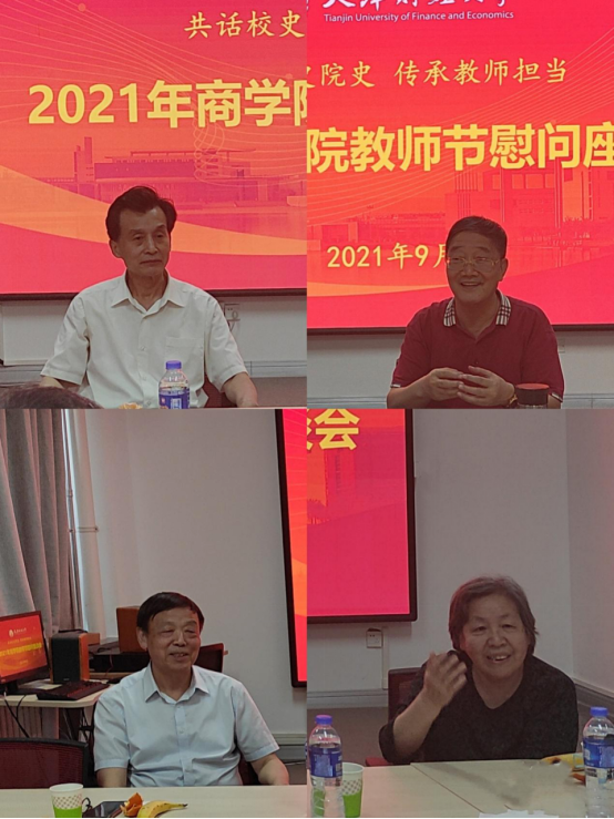彭院长首先对近期商学院在学科建设、专业建设、师德师风建设等方面所做工作及取得成绩向退休教授进行了简要汇报。张英华、曹家为、王天佑、孙慧中四位教授分别回顾了学校、商学院及企业管理系、市场营销系、旅游系的发展历程及所取得的成就,梳理了1958年建校,到2004年商学院成立,以及商学学科和各专业的发展演进脉络。通过退休教授的介绍,学院的中青年教师对商学前辈及院系的历史有了更深入细致的了解。与会教师纷纷表示要秉承商学前辈的治学精神,贯彻党的教育方针,落实立德树人根本任务,守初心、担使命,助力我校“新财经”建设。