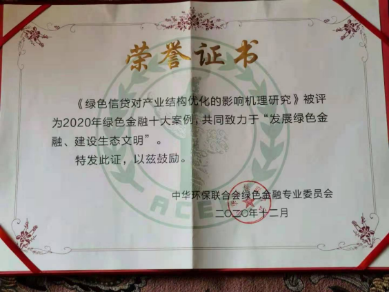 2020年12月20日上午,绿色金融十大案例发布会暨绿色金融发展论坛在北京召开。我院高晓燕教授带领研究生田轻云、本科生屈钊辉、吴冕参加了盛会,并上台领奖。会上,作为大学教师代表,高晓燕教授作题目为“绿色信贷对我国产业结构优化的影响”的主题发言。高晓燕教授所著论文《绿色信贷对产业结构优化的影响机理研究》荣获2020年绿色金融十大案例;《绿色信贷对我国上市商业银行经营绩效影响的实证研究》获得绿色金融十大案例提名案例。另外,她指导的本科生论文《我国绿色消费信贷产品的创新与因应策略研究——基于意愿调查法理论》获得2020年绿色金融十大案例提名案例,作者是能源金融专业大三学生屈钊辉、吴冕、申浩明、张玉皓。会上,绿色金融专业委员会秘书长王远对于高教授长期致力于绿色金融研究,带动研究生、本科生积极投稿,参加绿色金融会议的精神给予高度赞扬。