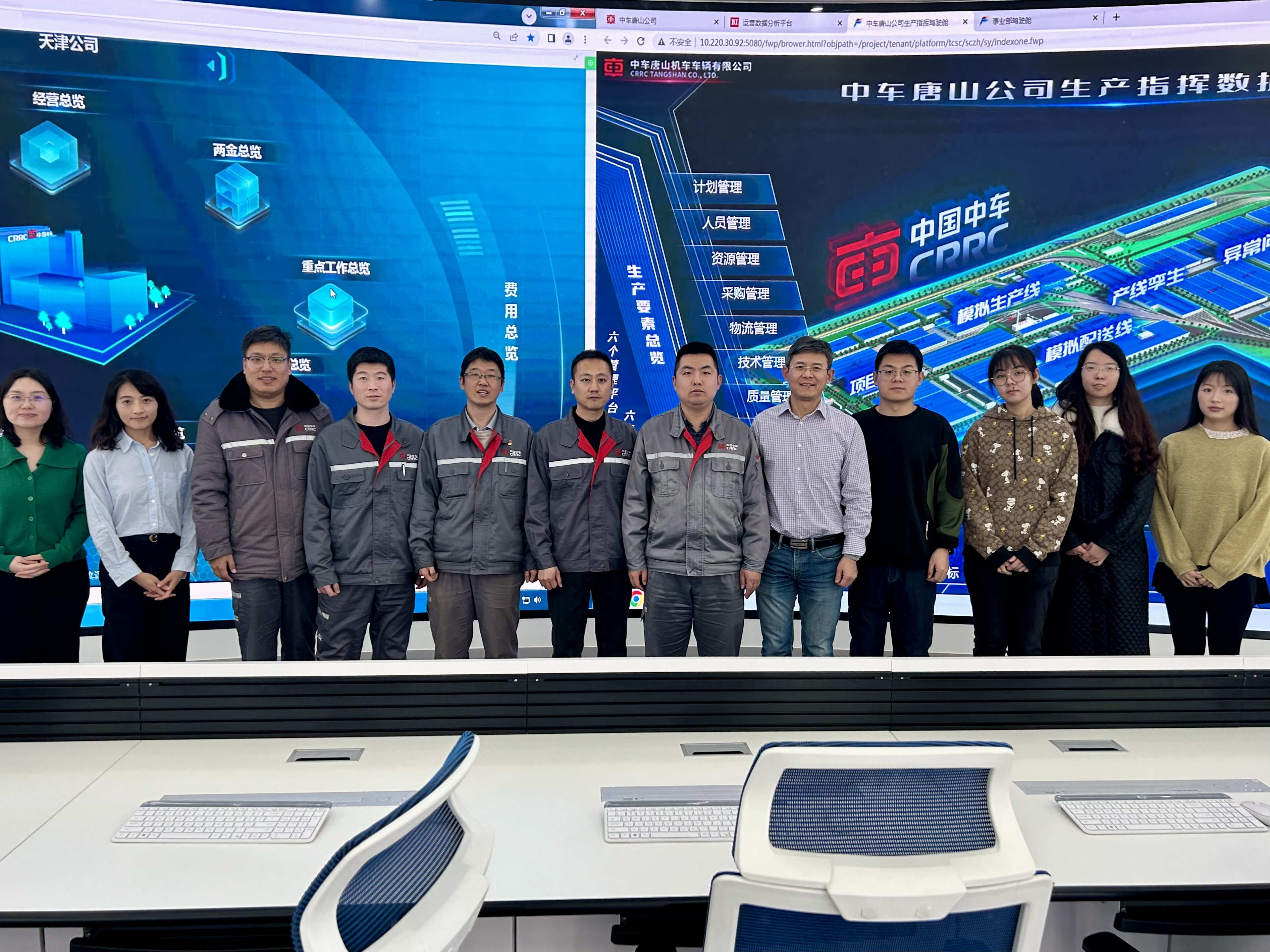 商学院调研团队深入不锈钢车体、组装等主要生产线,充分了解企业生产流程、工艺革新、智慧管理、产能产量、园区配套以及轨道交通装备产业链工作开展情况,参观了数字化生产指挥舱,天津中车唐车轨道车辆有限公司工会主席张树春、数字化改革办公室副主任张佳和技术主管张谦对公司现有数字化管理系统进行了详细介绍,包括生产指挥中心、物流调度指挥中心、数字化调试平台等。