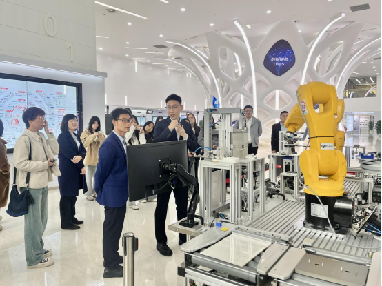 本次活动旨在通过实地走访国内领先的数智化企业,深入了解产业前沿动态与人才需求,共同研讨数智化时代财经类人才培养的创新模式。活动伊始,在新道科技天津分公司副总经理兰天宇的陪同和讲解下,学院一行参观了“用友数智企业体验馆”。作为国内首家综合型、融合化、生态式的数智企业体验中心,该馆全面展示了数智企业在营销、采购、生产、财务、人力、协同等核心业务场景的应用实践,为师生们呈现了企业数字化、智能化转型的生动全景。