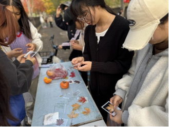 活动中,学生在采摘的同时不忘低头“捡个秋”,搜集不同颜色、形状各异的树叶放进透明的书签,把秋天定格在书签里,留住这个季节的专属记忆。