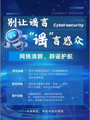 《抵制网络谣言》这幅海报画面以深邃的蓝色为主基调,象征着理性、纯净与科技感。屏幕中涌现的数据流与锁链元素,隐喻谣言如枷锁般具有破坏力,呼吁人们用法律与理性的钥匙将其打破。