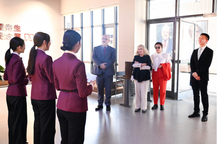 会后,加方团组走进“思贤堂”专题纪念展,近距离感受我校的学术积淀和育人传统。馆内陈列的泛黄手稿、珍贵影像及实物展品,吸引团组一行久久驻足,他们与学生讲解员频频互动,深入了解杨曾武、李宝震先生“严谨治学、潜心育人”的精神风范。随后,团组来到综合体育馆,参观了学校体育工作成就展,并对这座融书卷气息、体育精神与现代化设施于一体的场馆给予高度评价。