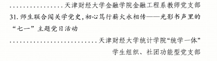 近日,市委教育工委、市教委公布了2024-2025年度教育系统“创最佳党日”优秀活动的命名结果,我校金融学院金融工程系教师党支部“党旗飘扬雪域高原 党建业务融合发展”主题党日活动和统计学院“统学一体”学生组织、社团功能型党支部“师生联合闯关学党史,初心笃行薪火永相传——光影书声里的‘七一’主题党日活动”获评天津市教育系统“创最佳党日”优秀活动。