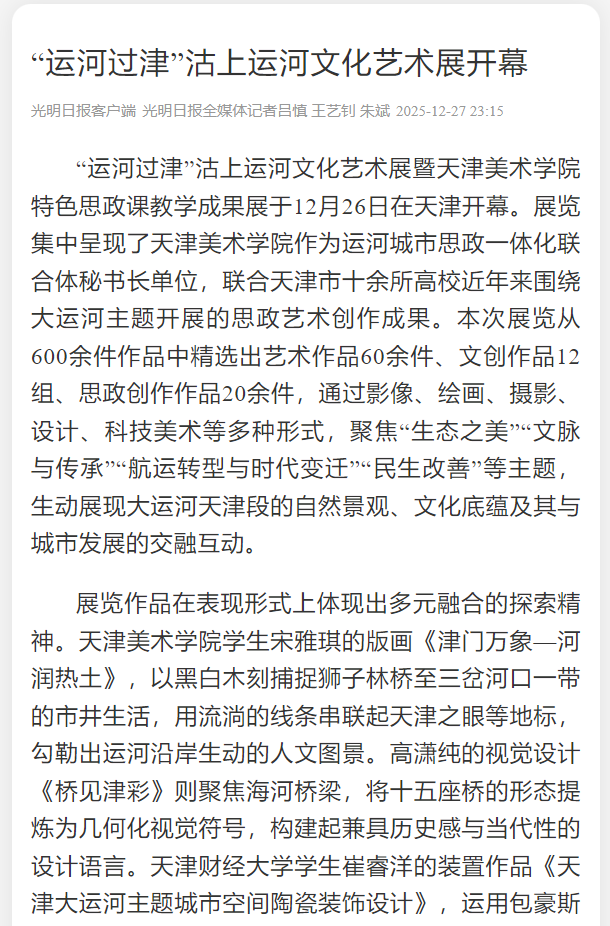 “运河过津”沽上运河文化艺术展暨天津美术学院特色思政课教学成果展于12月26日在天津开幕。展览集中呈现了天津美术学院作为运河城市思政一体化联合体秘书长单位,联合天津市十余所高校近年来围绕大运河主题开展的思政艺术创作成果。本次展览从600余件作品中精选出艺术作品60余件、文创作品12组、思政创作作品20余件,通过影像、绘画、摄影、设计、科技美术等多种形式,聚焦“生态之美”“文脉与传承”“航运转型与时代变迁”“民生改善”等主题,生动展现大运河天津段的自然景观、文化底蕴及其与城市发展的交融互动。