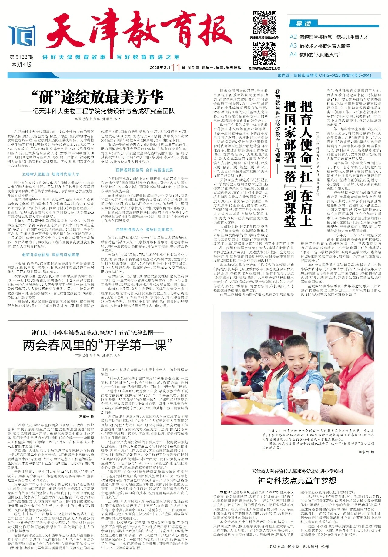 《天津教育报》刊登我校党委书记赵鸣两会学习反响