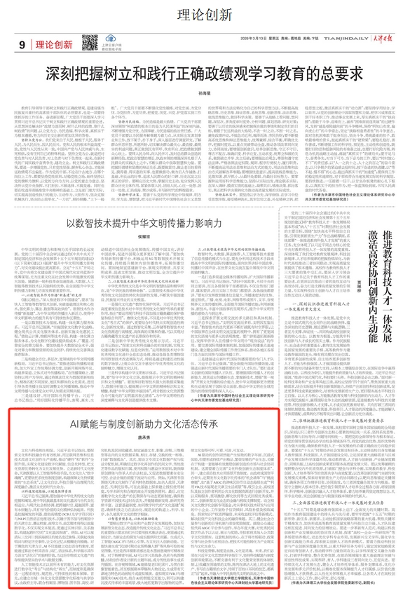 文化与科技相生相促。习近平总书记指出,要探索文化和科技融合的有效机制,用互联网思维和信息技术改进文化创作生产流程,推动“硬件”和“软件”全面升级,实现文化建设数字化赋能、信息化转型,把文化资源优势转化为文化发展优势。立足新时代文化使命,天津既要以人工智能等科技手段,为文化注入“数字魂魄”,更要依托系统性制度创新,构建保障文化持续繁荣的“生态系统”,让文化自信、科技自强与治理现代化深度融合,激活文化的时代生命力。