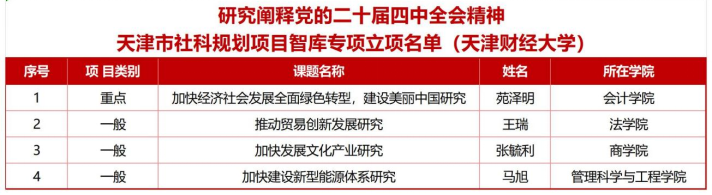 近日,天津市哲学社会科学工作办公室公布了“研究阐释党的二十届四中全会精神”天津市社科规划智库专项立项名单。我校在此次申报中表现突出,共获批4项课题,其中包括重点课题1项、一般课题3项,立项数量较去年实现翻番。