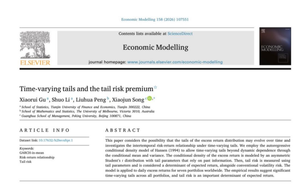 近日,我校统计学院数量经济学专业博士研究生顾小锐(导师:李硕副教授)以第一作者身份,与李硕副教授、澳大利亚墨尔本大学彭柳华教授、北京大学宋晓军教授合作完成的学术论文《Time-varying tails and the tail risk premium》,在国际权威期刊《Economic Modelling》正式发表。这是我校持续推进研究生国际化培养、深化高水平科研合作取得的又一标志性成果。