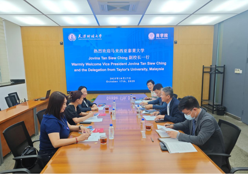10月17日,马来西亚泰莱大学(Taylor’s University)由副校长Jovina Tan Siew Ching 率队一行三人莅临天津财经大学进行友好访问。此次来访是泰莱大学首次正式组团到访我校,也是我校“新财经建设工程”启动以来迎来的首个马来西亚高水平大学代表团。会谈由商学院党委副书记、院长张建宇主持,商学院国际与交流合作处相关负责人出席了会议。