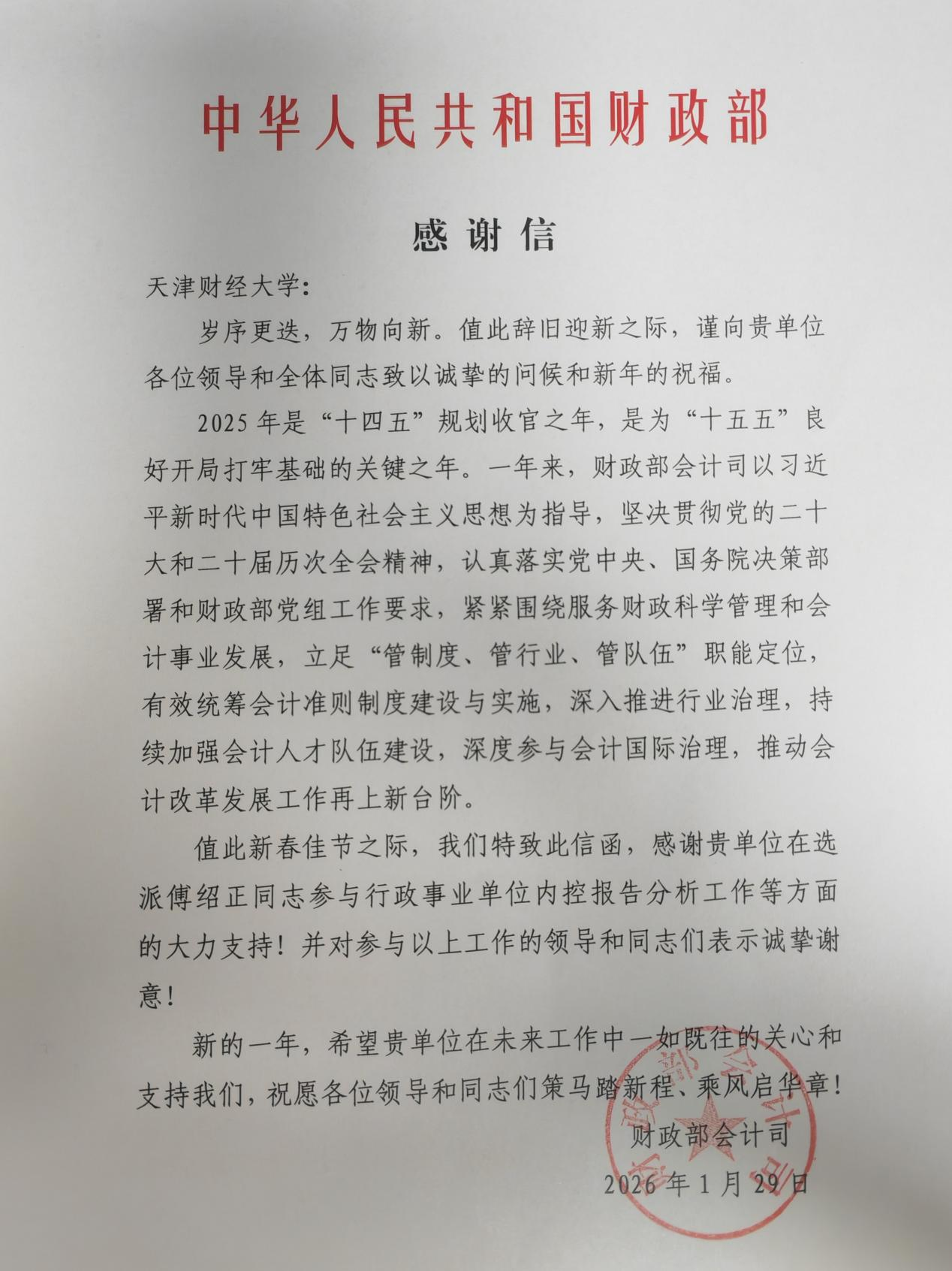 近日,财政部会计司向我校发来感谢信,对我校选派会计学院傅绍正同志参与行政事业单位内部控制评价报告分析工作,以及在相关工作中给予的大力支持表示诚挚谢意。